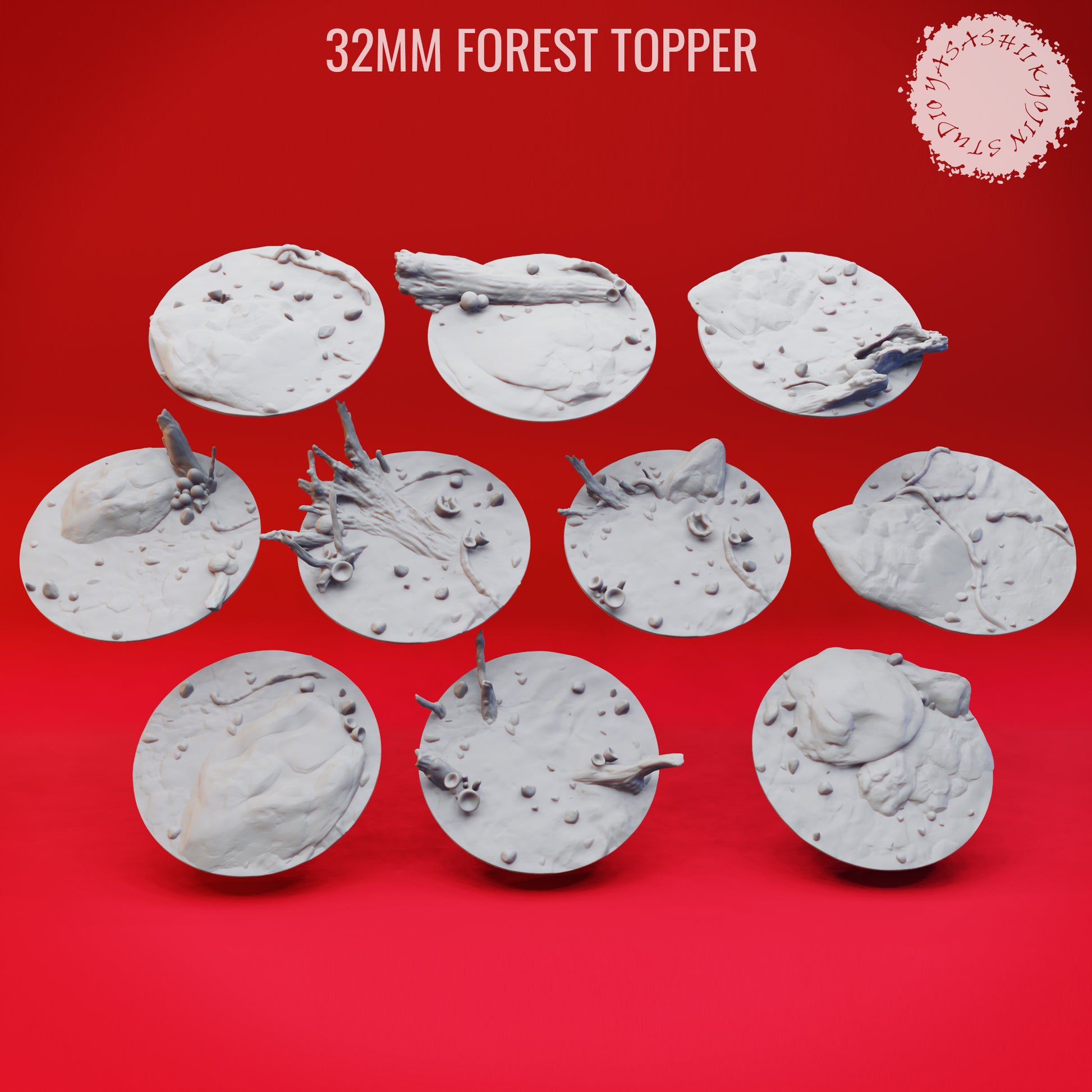 10 pack of 32mm Forest themed base toppers for tabletop gaming. Designed with a consistent scale to match other topper sizes.